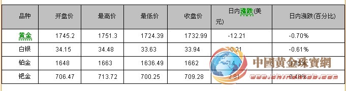 周三,貴金屬價格漲跌不一。黃金和白銀走勢出現了一定的震蕩下調,而鉑金、鈀金依舊保持了上升態勢。歐元區債務問題,特別是希臘債務問題的談判直接影響了市場投資者的投資預期。希臘到目前為止對于救助計劃仍舊沒有給出明顯的答案,使得市場投資者擔心希臘能否得到救助產生懷疑。同時,對于意大利第四季度經濟可能出現萎縮、德法兩國的不佳消息均使得投資者對于歐洲經濟形勢再度生疑。這些負面消息使得黃金和白銀走勢承壓。