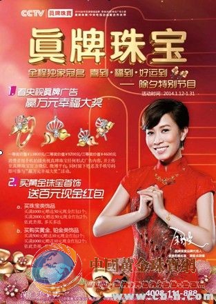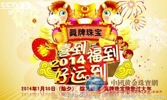 農歷春節將至,真牌珠寶在一片歡樂喜慶的氛圍中展開了品牌拓展之路,2014年真牌珠寶斥巨資在央視打造品牌,獨家冠名CCTV-3馬年春晚除夕特別節目《喜到?福到?好運到》,大年三十陪全國觀眾一起過大年。同時真牌珠寶全年簽約央視三套晚間黃金檔,網羅綜藝頻道極具號召力的精品欄目,品牌廣告同步播出,為真牌珠寶的品牌知名度和美譽度帶來全面的提升!