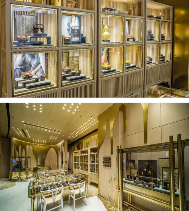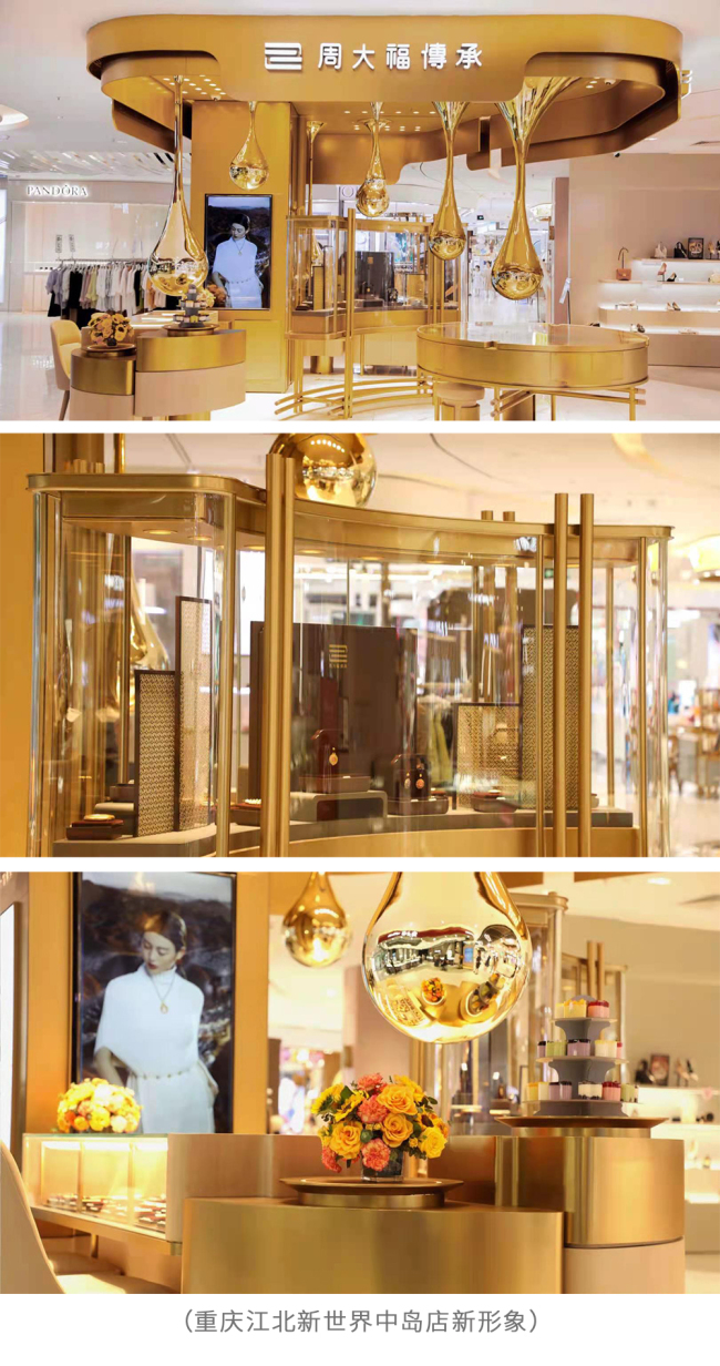 無論是產(chǎn)品,還是服務(wù),周大福傳承都在努力創(chuàng)新和不斷提升。針對不同的區(qū)域性市場與人群、適應(yīng)不同的消費購物場景,周大福傳承專營店也在不斷升級和豐富著店面形象,希望能為顧客帶來更加豐富的視覺體驗以及更加優(yōu)質(zhì)的購物氛圍。2021年8月,面對以文化著稱的重慶,并為了更好匹配江北新世界的購物環(huán)境,除繼續(xù)延續(xù)傳承理念,加筑經(jīng)典底蘊,更是大膽應(yīng)用“鎏金滴落”的效果,在立體化呈現(xiàn)下更令人震撼,所使用的鏡面金,造型獨特、質(zhì)感不凡。