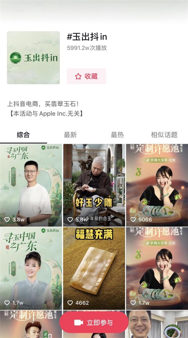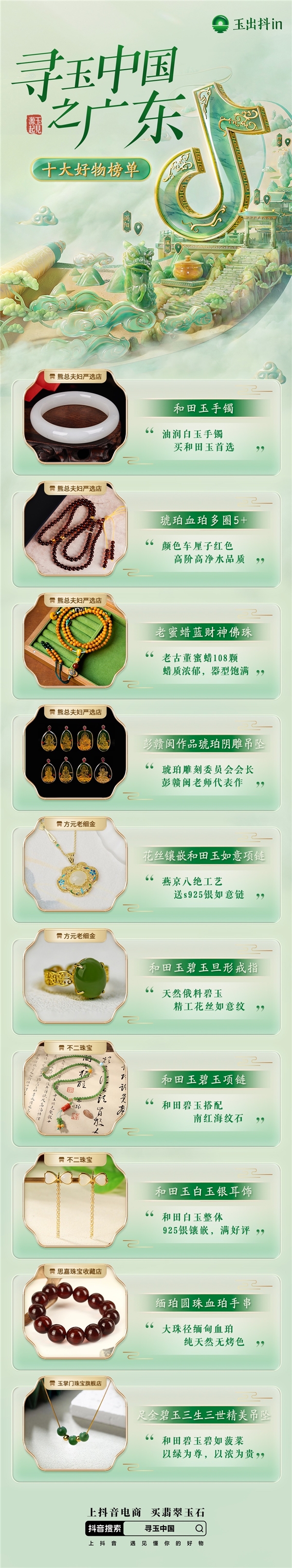 在抖音電商,不僅有無數(shù)玩家、達(dá)人持續(xù)生產(chǎn)翡翠玉石文化內(nèi)容,同時(shí)也匯聚了海量翡翠玉石商家。為了讓更多人在抖音邂逅美玉,抖音電商面向翡翠玉石行業(yè)打造了品類專項(xiàng)IP「玉出抖in」,推出包括「玉見源起-尋玉中國(guó)」「玉見定制-定制許愿池」等一系列活動(dòng),凝聚行業(yè)與平臺(tái)之力,以專業(yè)內(nèi)容、生動(dòng)場(chǎng)景、優(yōu)質(zhì)貨源,不斷傳遞著翡翠玉石文化。