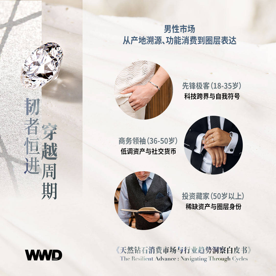 男性市場則由產地溯源、功能消費、圈層表達驅動。18-35歲先鋒極客偏好科技感設計,關注電競、潮玩等跨界圈層;36-50歲商務領袖注重投資屬性與商務場景適配性,將鉆石視為低調資產和社交貨幣;50歲以上投資藏家偏好收藏級鉆石,更加關注產地倫理和公益屬性。