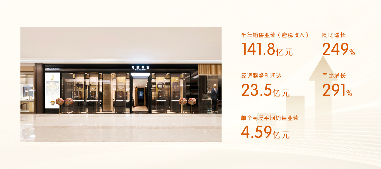 8月20日,古法手工金器第一品牌——老鋪黃金(6181.HK)發布截至2025年6月30日止六個月中期業績,半年銷售業績(含稅收入)達141.8億元,同比增長249%;經調整凈利潤達23.5億元,同比增長291%,營收和利潤雙雙持續呈高增長。