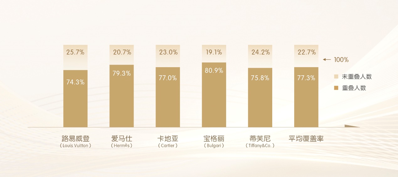 據弗若斯特沙利文調研數據顯示,老鋪黃金消費者與路易威登、愛馬仕、卡地亞、寶格麗等國際五大奢侈品牌的消費者平均重合率接近八成,這意味著國際奢侈品牌消費者越來越多轉向老鋪黃金,而中國品牌也首次成為高端消費的主流力量。