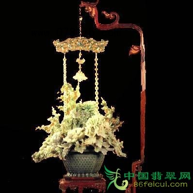 翡翠花籃《群芳覽勝》,作品高64cm,其中滿插牡丹、菊花、月季、山茶等四季香花,是當今世界最高大的一個翡翠花籃,這只籃上的兩條玉鏈各40cm長,并各含32個玉環。玉雕大師足足花了整整八個月的時間才得以完成。