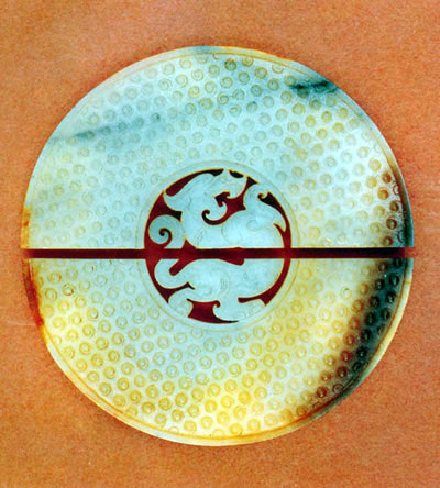 說明:玉料青白色。體扁平,兩面形式和紋飾相同。邊緣無棱,表面飾凸起的谷紋,谷粒渾圓,是用管形鉈具套磨琢而成。璧孔內鏤雕一螭龍。整器對剖成兩半,可作信物或合符用。